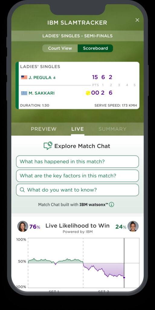 The rapid developments in AI technology have been fully embraced by Wimbledon and the IBM team, with ‘Match Chat’ their flagship new feature that can be found on the tournament app and the website.