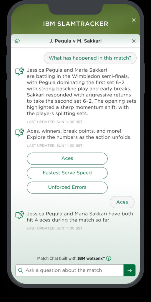 So if you want to know how many aces a player has hit in the match you are watching, you can type that into the AI-driven agents that are trained on the Wimbledon editorial style and the language of tennis.